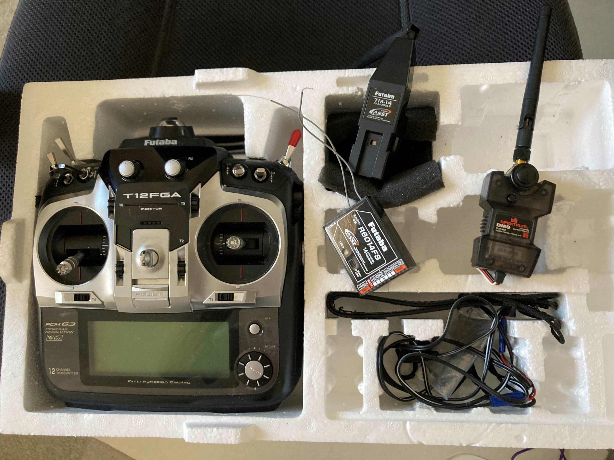 Description: Futaba 12 channel with Futaba FASST TM-14 module and Spectrum module. Futaba R6014FS Rx, neck strap and charge plug. No servos.